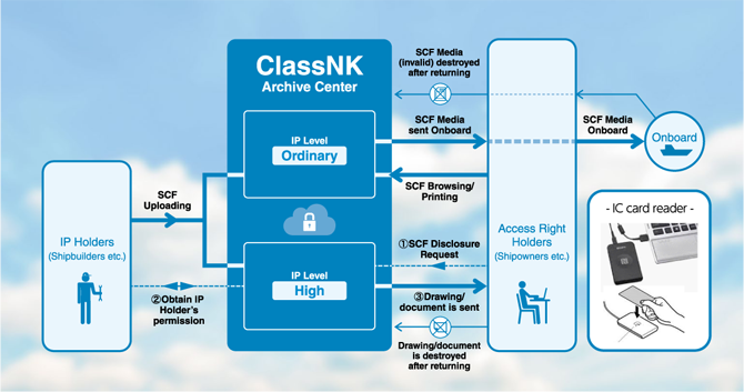 A shipyard, as the intellectual property (IP) holder, is requried to provide a Ship Construction File (SCF), which contains structural drawings based upon design and construction information, to a shipowner. As the party responsible for the storage of such information, the shipowner is then required provide means for safely and securely storing said information on board concerned ships throughout their operational lifetimes. Since this information includes highly-sensitive intellectual property matters related to shipbuilders, storage in a shore-based secure archive center is permitted.