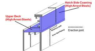 As container ships increase in size, so too does the thickness of the steel that is used. The preventative measures for brittle fracture become even more important with thicker steel especially in areas where higher stress occurs such as the upper deck and hatch side coaming of the cargo holds.