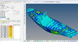The updated software, in response to latest rules, enables designers to perform torsional strength assessments by superimposing stress components generated by working hull girder load on an FE model of an entire ship. (See Figure 2. below)