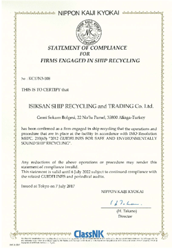 Tokyo – Leading classification society ClassNK (Chairman and President: Koichi Fujiwara) has issued a Statement of Compliance (SoC) to a ship recycling facility in Izmir, Turkey, ISIKSAN SHIP RECYCLING and TRADING Co. Ltd. (Company Manager: Ömer DOĞAN), verifying that the facilities are in line with the Hong Kong International Convention for the Safe and Environmentally Sound Recycling of Ships, 2009 (HKC).