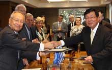 A signing ceremony to commemorate the agreement between the two partners was held at the Foundation’s headquarters in Athens on 29 November 2013. ClassNK Chairman and President Noboru Ueda, and "Maria Tsakos" Foundation Chairman and IMO Secretary-General Emeritus Efthymios Mitropoulos signed a Memorandum of Understanding on behalf of their respective organizations. They were joined by a number of distinguished guests including Captain Panagiotis Tsakos, Founder of the Tsakos Group of Companies, Mr. V. Papageorgiou, Vice President of the Group and Dr. S. Krimizis, Chairman of the Foundation’s Scientific Council, among others.