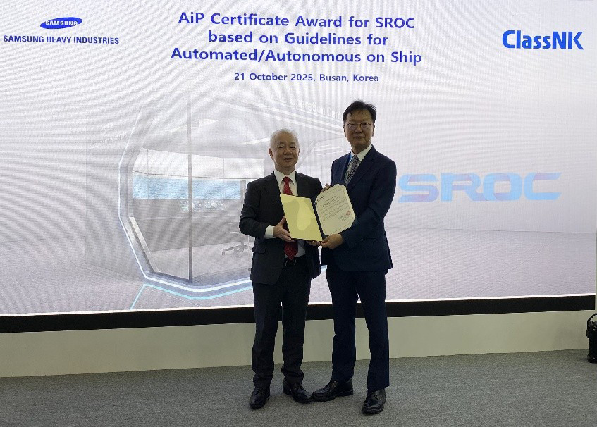 一般財団法人日本海事協会(ClassNK)は、サムスン重工業が開発を進める陸上遠隔監視システム「Samsung Remote Operation Center (SROC)」 に対し基本設計承認(AiP)を発行し、釜山(韓国)で開催されている展示会「KORMARINE 2025」で証書授与式を行いました。